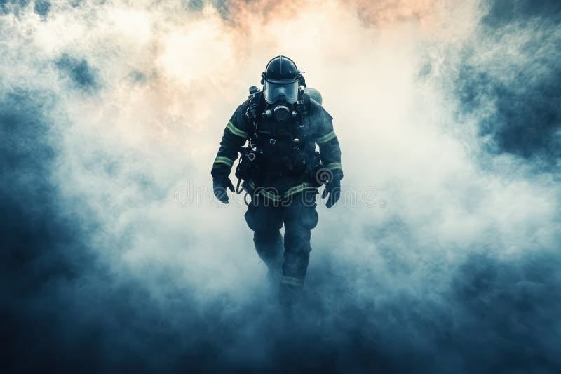 Firefighter heroically emerging from smoke, symbolizing resilience